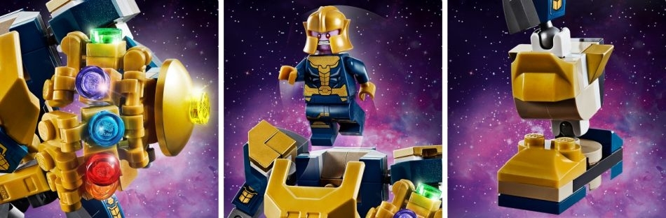 Το Thanos Mech της σειράς Marvel περιλαμβάνει 152 τουβλάκια και 1 μίνι φιγούρα. Στην μεγαλύτερη εκδοχή του ο Thanos διαθέτει καμπίνα που ανοιγοκλείνει, κινούμενα άκρα και διάφορα αξεσουάρ.