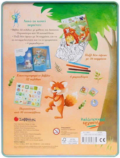 Αυτό το φανταστικό σετ ζωντανεύει τους αγαπημένους Μύθους του Αισώπου με έναν μοναδικό, διαδραστικό τρόπο! Μέσα στο όμορφο κουτί θα βρείτε ένα βιβλίο 32 σελίδων με κλασικές, διδακτικές ιστορίες του Αισώπου, αλλά η περιπέτεια δεν σταματά εκεί! Το σετ περιλαμβάνει επίσης υλικά για ατέλειωτο παιχνίδι και δημιουργία: πάνω από 30 απίθανα αυτοκόλλητα, ένα παζλ δύο όψεων με 36 μεγάλα κομμάτια για να το συναρμολογήσετε και μετά να το χρωματίσετε, και 4 μαρκαδόρους για να δώσετε τη δική σας καλλιτεχνική πινελιά!